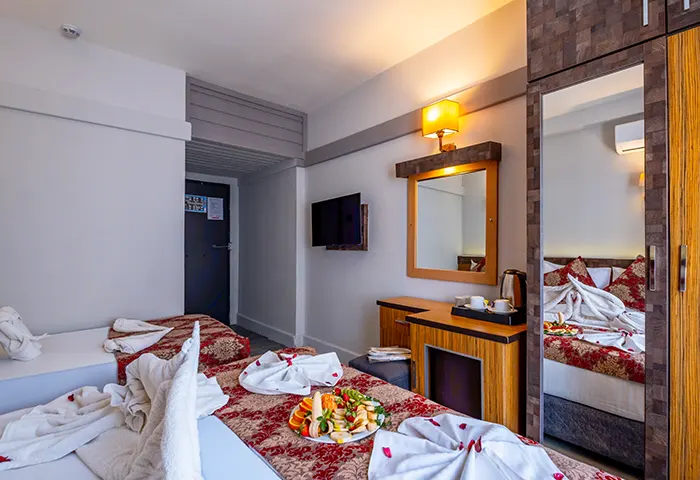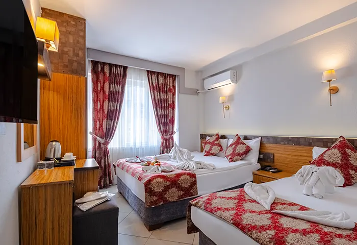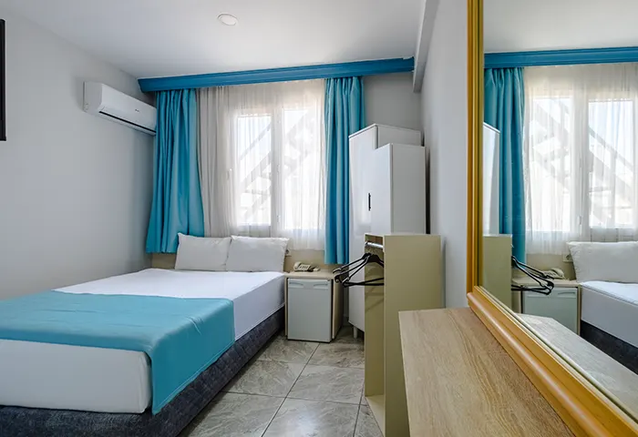 Tek büyük yatak veya iki ayrı yatak seçeneği sunan bu oda tipi, farklı konaklama ihtiyaçlarına uygun esnek bir kullanım sağlar. Konforlu yapısı ve sıcak atmosferiyle misafirlerin dinlenebileceği rahat bir alan sunarken, keyifli ve huzurlu bir konaklama deneyimi yaşamanıza yardımcı olur.